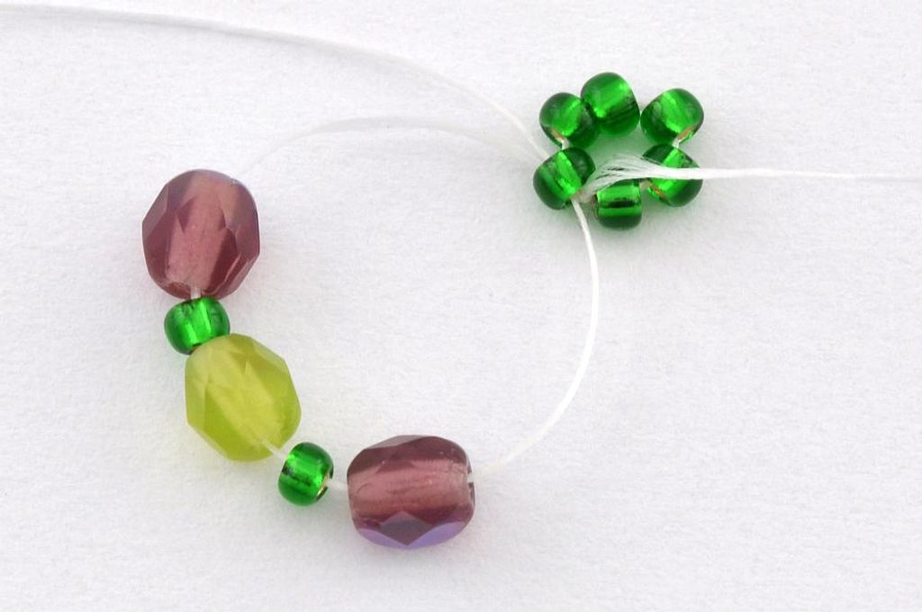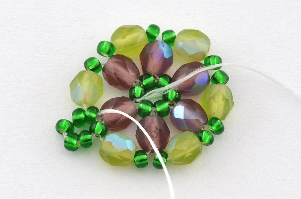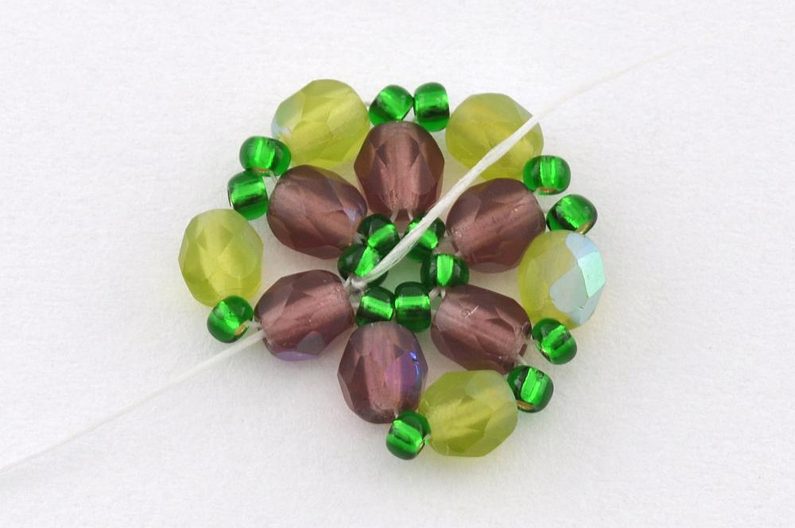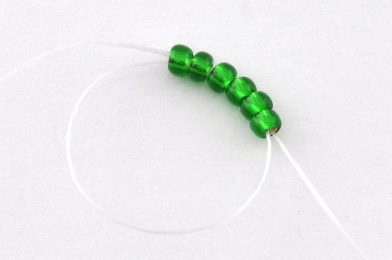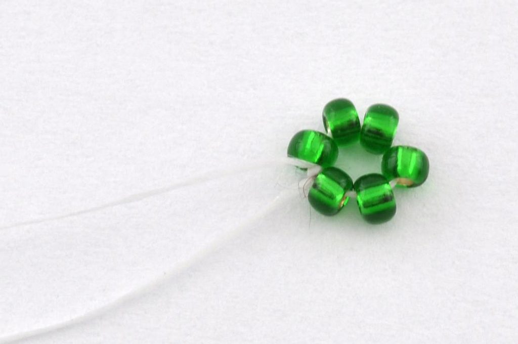 Začneme navlečením šesti PR10 na nit. Konec nitě necháme dostatečně dlouhý pro pozdější zavázání a zapošití. Navlečené korálky prošijeme ještě jednou a nit utáhneme. Vznikne tak kolečko, které můžeme zajistit svázáním konců nití.