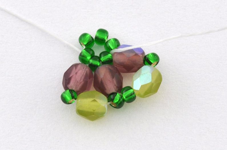 Nit provlečeme korálky k druhému konci nitě a oba je pevně svážeme. Než konce ustřihneme, prošijeme je několika korálky. Díky tomu nikde nebudou trčet.