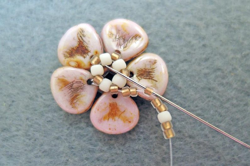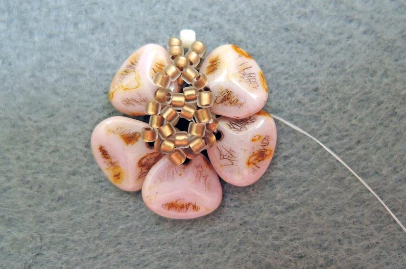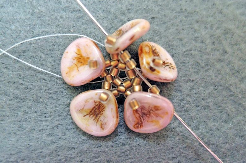 4. řada: Za každý TR15 nad korálkem Rose petal si přidejte po jednom TR11. Několikrát prošijte a utahujte. Nyní si můžete zapošít a ustřihnout kratší konec Fireline.