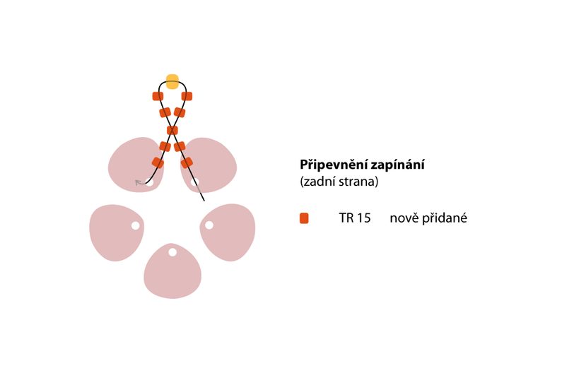 Nyní přidáme skupinku korálků, do které si na konci připevníte zapínání. Prošijte si jehlou tak, aby vycházela za jedním TR15 ve středovém kroužku (obr. 6). Navlékněte 5 TR15, 1 TR11, 2 TR15, pouze prošijte 3. navlečený TR 15 (obr. 7), přidejte další 2 TR 15 a všijte do následujícího TR ve středovém kroužku. Důkladně utáhněte (obr. 8).