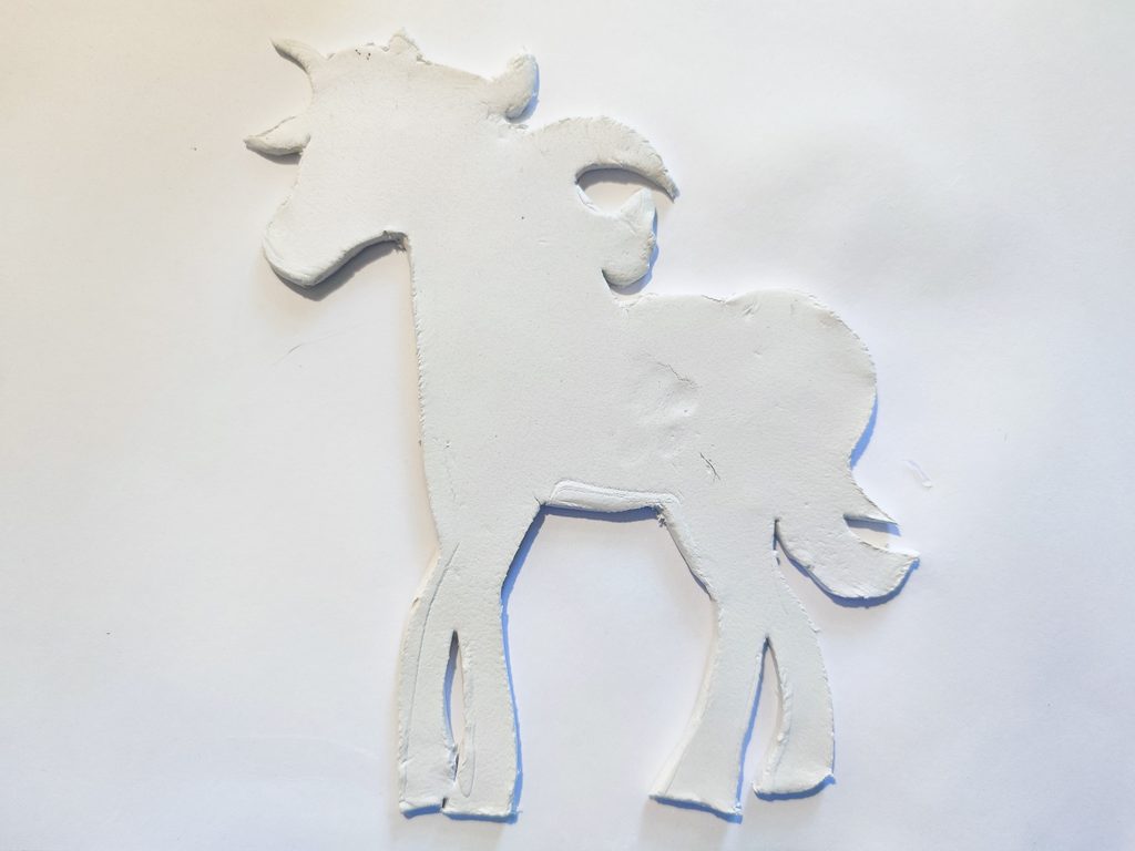 Na papír si nejprve nakreslíme tvar jednorožce, který poté vystřihneme a poslouží nám jako šablona.