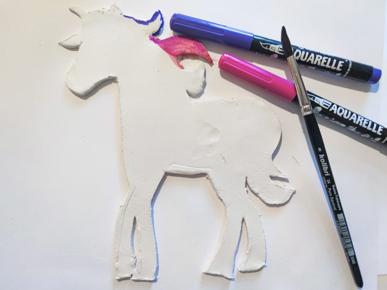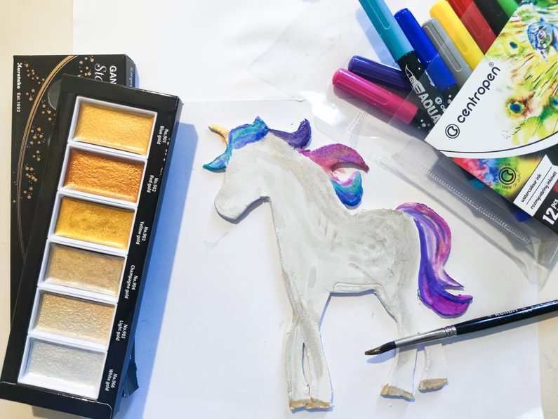 Jakmile je hmota bílá, bez šedých skvrn, můžeme na ní dále malovat. Detaily jednorožci domalujeme pomocí akvarelových fix a metalických akvarelových barev.