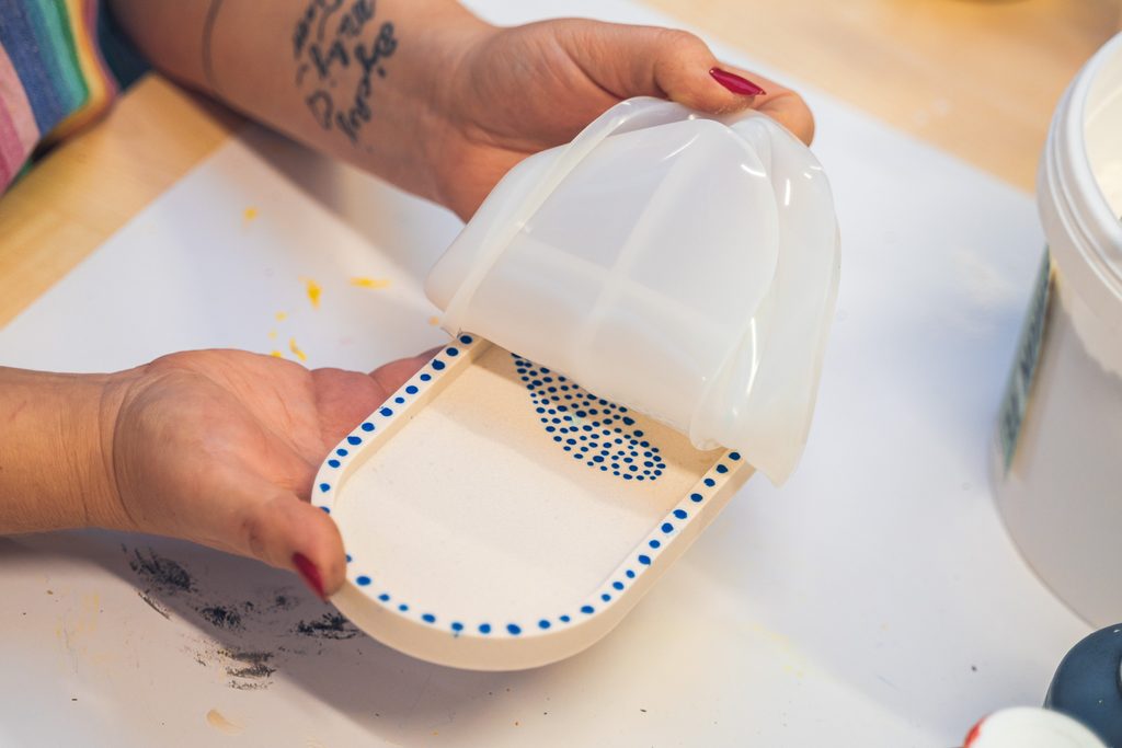 Nejprve si připravíme malé množství směsi, kterou namalujeme ornament, v tomto případě srdíčko a modrými tečkami ozdobíme i budoucí okraj podtácku. Bude nám stačit směs 5 g tekuté a 13 g sypké složky. Obarvíme ji kapkou modrého (nebo třeba červeného) pigmentu. Směs si naplníme do kapátka, na štětec nebo na obyčejnou špejli a pomocí toho malujeme na dno silikonové formy. Jakmile jsme s obrazcem hotovi, necháme jej cca 5 minut zaschnout.