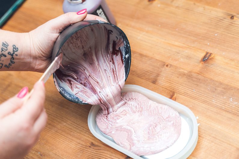 Rozmícháme si směs Jesmonite a přidáme pár kapek pigmentu.