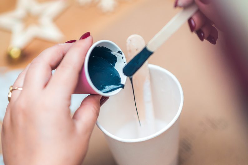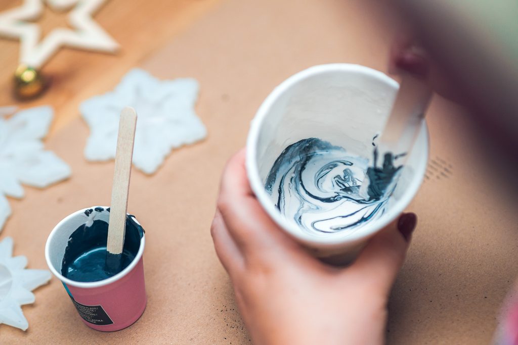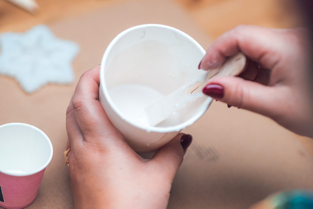 Ze sypké a tekuté složky Jesmonite si připravíme licí směs a následně část směsi odlijeme do menšího kelímku.