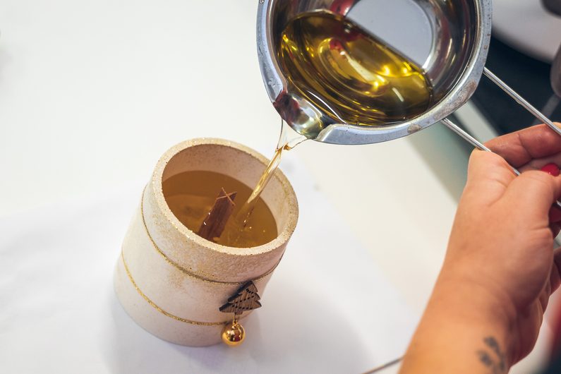 Na dno nádoby nalepíme dřevěný knot, který jsme si před tím zasunuli do stojánku. Poté nalijeme vosk. Jeho hladinu můžeme lehce poprášit třpytkami, které jsme předtím použili na vysypání formy.