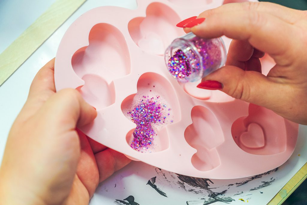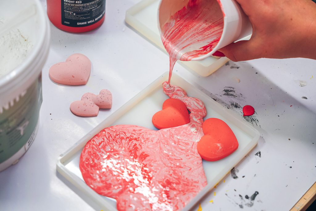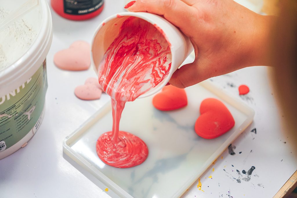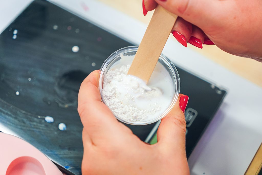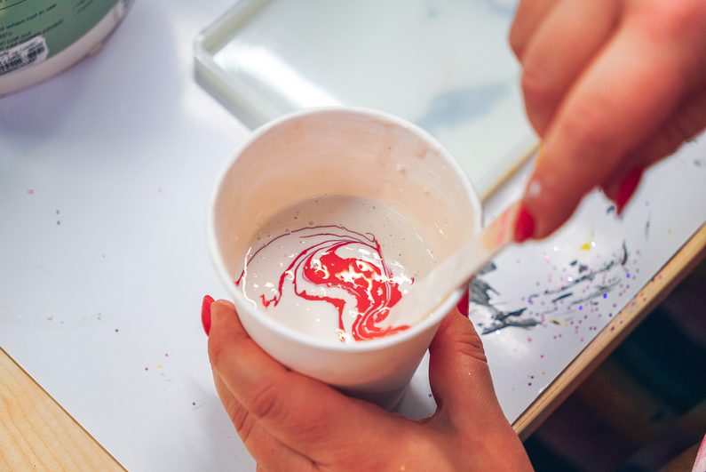 Rozmícháme si malé množství hmoty Jesmonite v uvedeném poměru a obarvíme ho kapkou pigmentu.