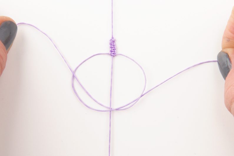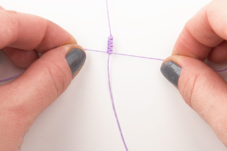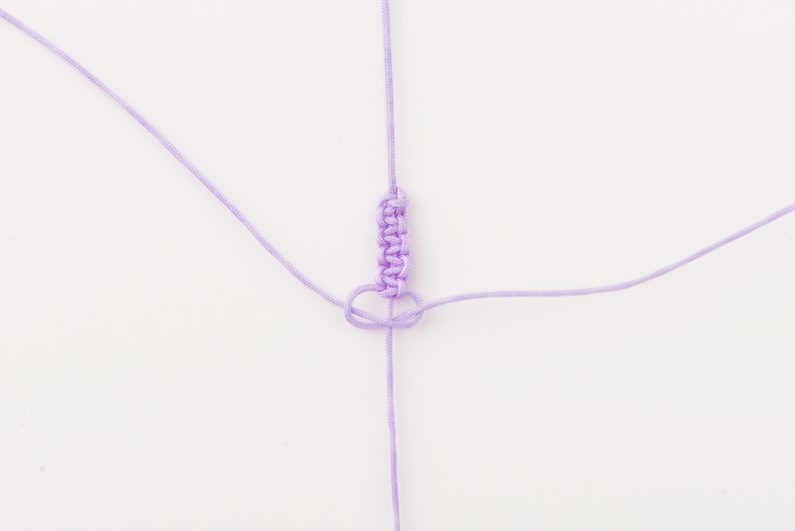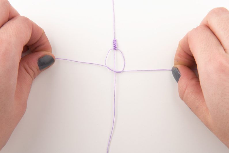 Tento postup opakujeme zrcadlově na pravé straně. Pravou šňůru přeložíme přes hlavní šňůry náramku. Levou šňůru vedeme pod hlavními šňůrami a vytáhneme ve vytvořeném oku z pravé šňůry. Očko utáhneme.