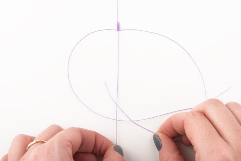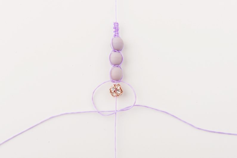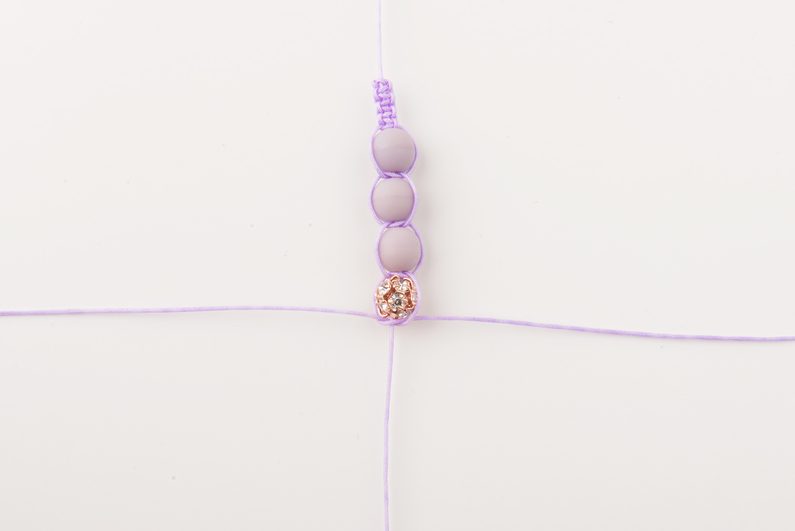 Vložíme další korálek a opět kolem něj vedeme šňůry, poté klasicky zauzlíkujeme.