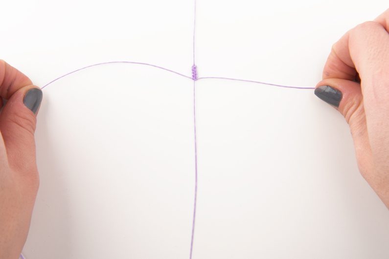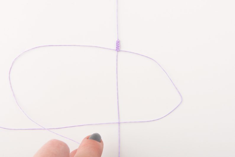 Začneme prvním uzlíkem typu Macrame. Levou šňůru přeložíme přes hlavní šňůry náramku.