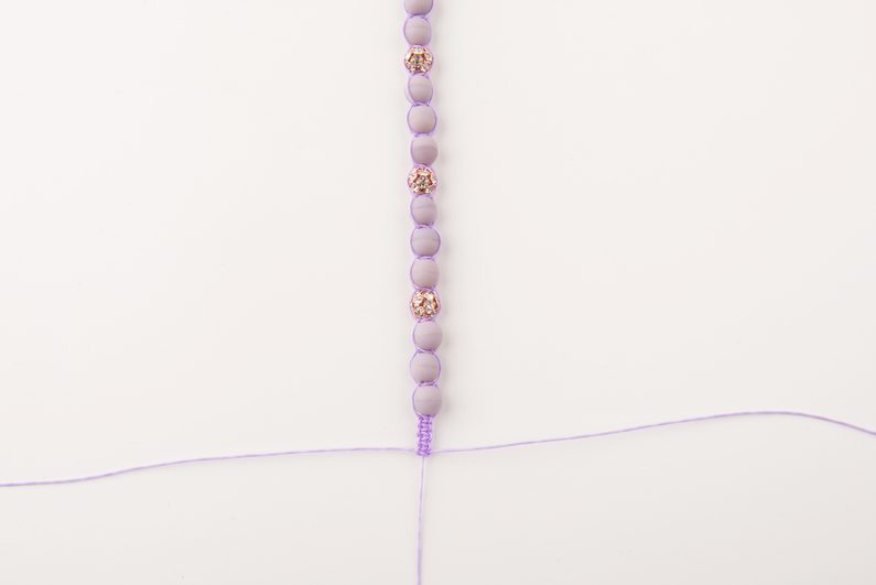 Vytvoříme 9 uzlíků a vždy než uděláme následující uzlík vložíme na hlavní šňůru korálek a kolem něj povedeme klasicky uzlík.