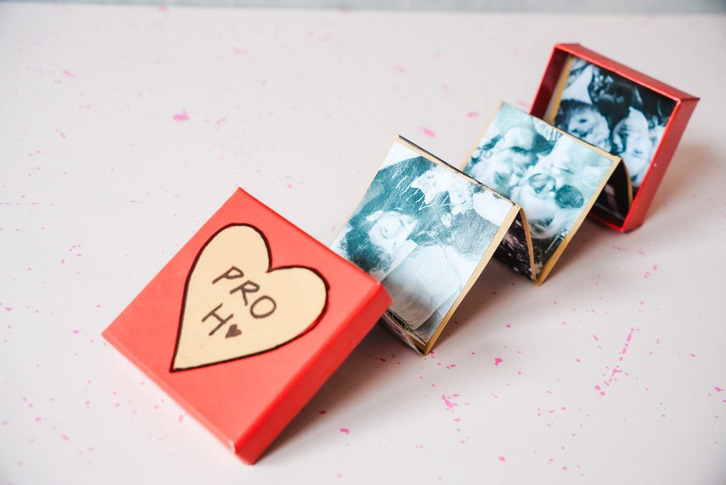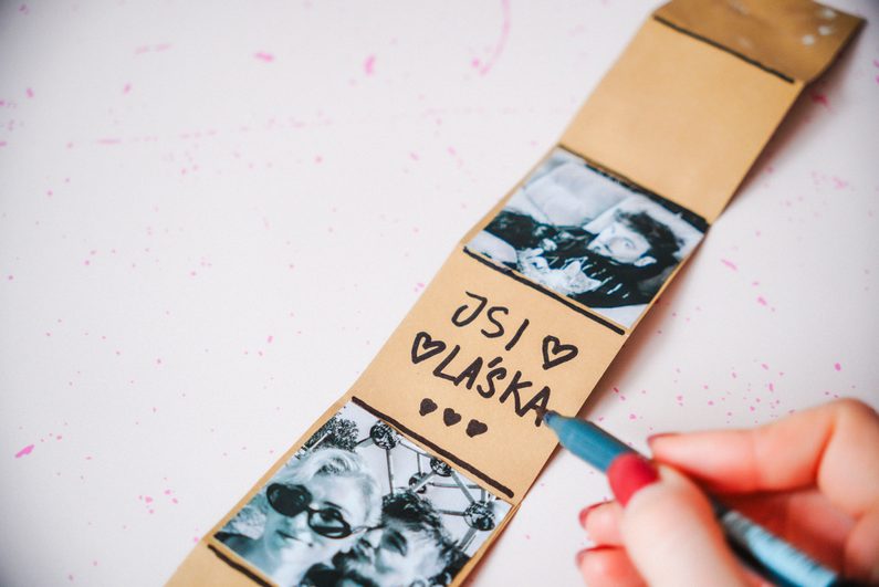 • Harmoniku s fotkami složíme dovnitř a krabičku zavřeme. Následně ji můžeme ještě ozdobit, napsat věnování nebo vzkaz podle sebe.