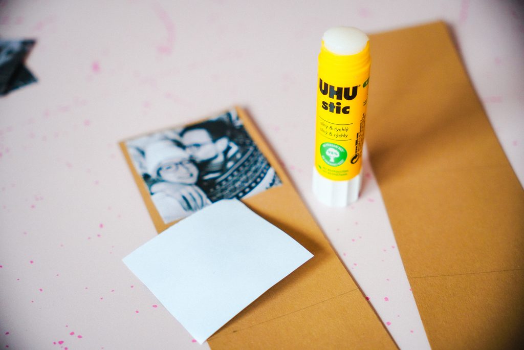 • Na pruh nalepíme fotky z obou stran, případně můžeme doplnit o nějaký vzkaz. Na koncích si necháme jeden vždy jeden čtverec volný.