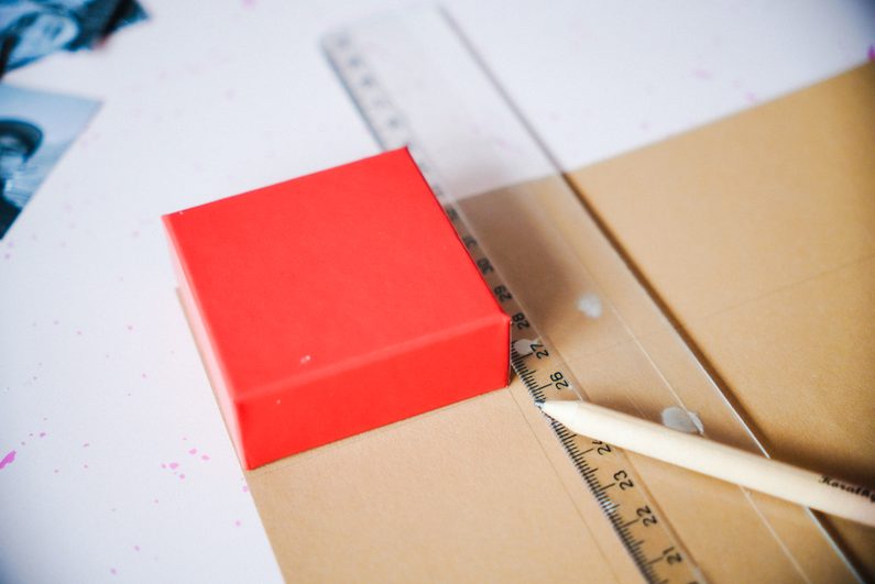 • Vezmeme si kraftový papír a pomocí pravítka a zvolené krabičky si změříme požadovanou šířku pruhu. Ustříhneme si dva takové pruhy a lepidlem je spojíme k sobě. Pokud si chcete udělat harmoniku z fotek delší, ustřihněte si pruhů více, je to jen na vás a na velikosti zvolené krabičky.