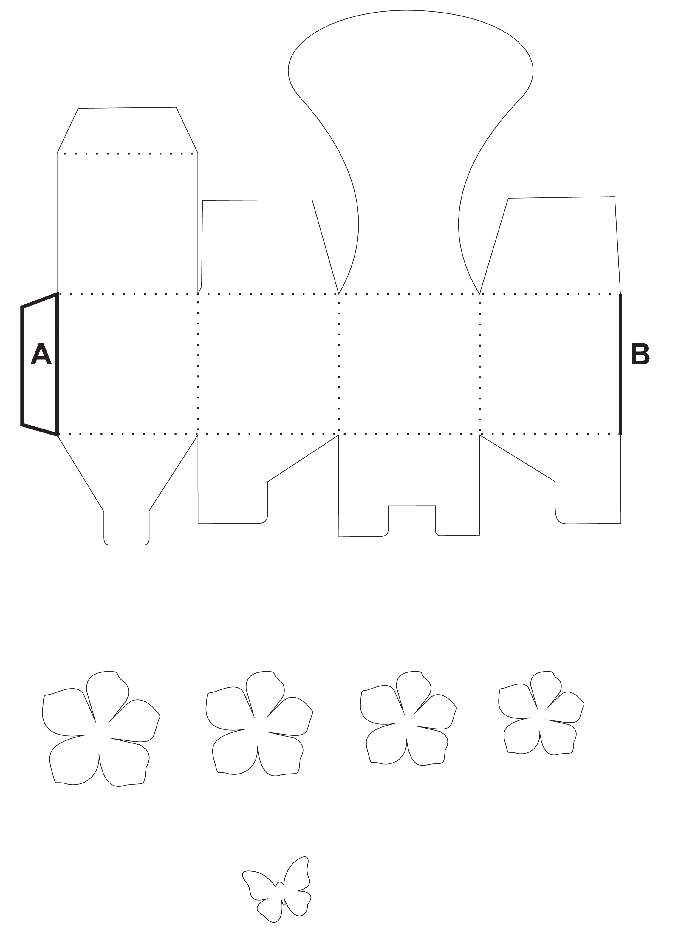 Krabičku složíme a boční díly krabičky slepíme dohromady viz šablona A a B. Spodní část krabičky složíme dle návodu bez lepení.