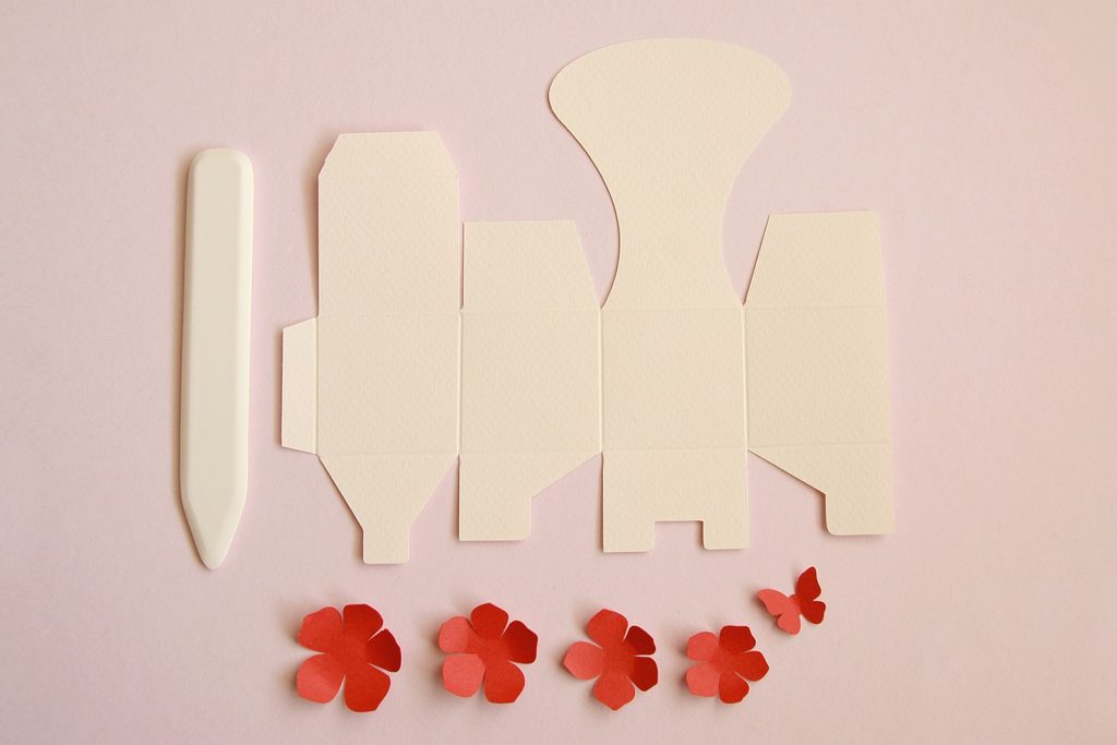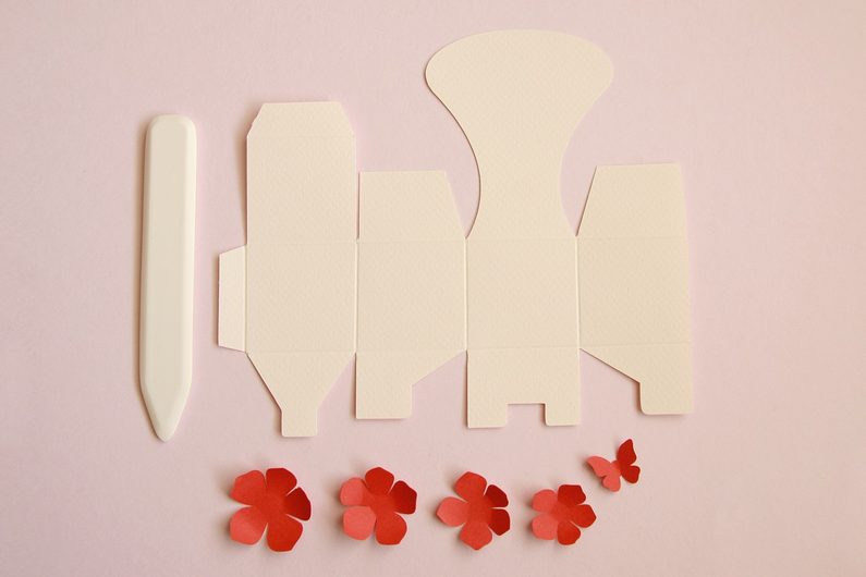 Uděláme ohyby pro složení krabičky. Pokud máte rýhovací desku s knihařskou kostí, bude rýhování jednodušší. V opačném případě postačí pravítko, abychom věděli kudy ohyb povedeme.