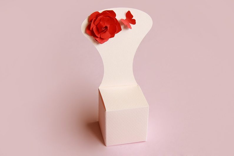 Kytičku i motýlka máme připravené k nalepení na židličku, předem než začnete lepit si odzkoušejte kam kytičku a motýlka přilepíte. Máme hotovo a teď už záleží na vás jestli krabičku dozdobíte stužkou a textem.