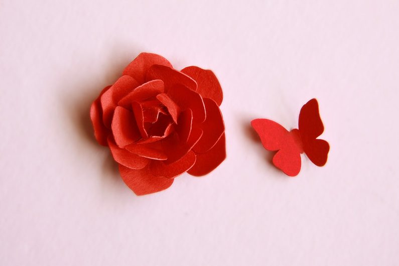 Nyní si sestavíme kytičku. Okvětní lístečky zlehka ohněte knihařskou kostí od středu nahoru. Nejmenší okvětní lísteček zlehka prsty zmáčkneme tak,ať se uzavře, případně můžete použít kancelářské lepidlo a v bodech podpořit, ať se střed květu neotvírá. Okvětní lístečky budeme postupně na sebe vrstvit od největšího po nejmenší. Slepujeme tavnou pistolí pro rychlejší a pevnější spoj. Motýlkovi zlehka přizvedneme křidýlka, aby vypadal, že opravdu letí.