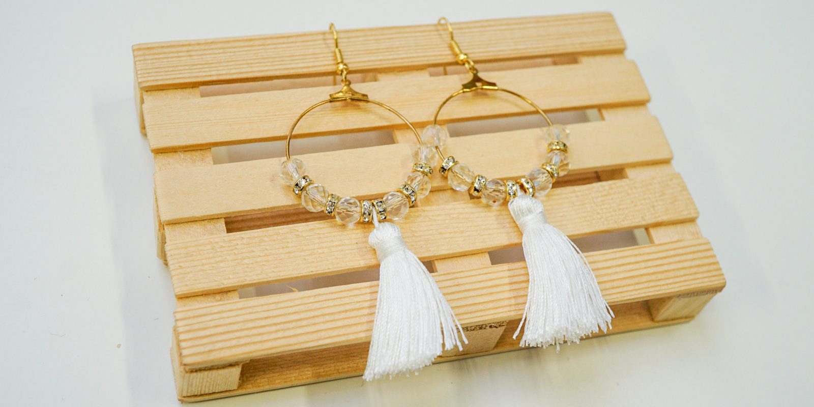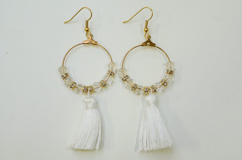 Na náušnicovou kreoli navlékneme minerálové korálky, štrasové rondelky a střapec podle vzoru. Kreoli uzavřeme. Aby se kreole nerozevírala, pojistíme spoj vteřinovým lepidlem.