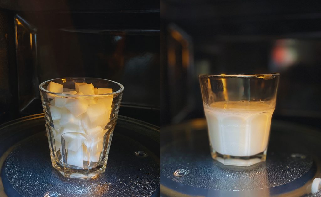 Mýdlovou hmotu si rozdělte na malé čtverečky, aby se jednoduše rozpustily. Vložte je do nádoby která může jít do mikrovlnné trouby.