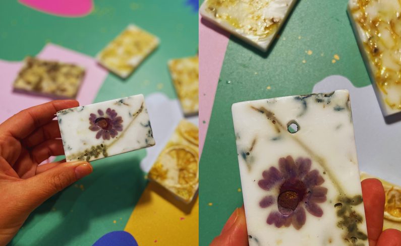 Následně mýdlíčka vyjmeme z formy a nůžkami vytvoříme otvor, skrze který provlečeme provázek na zavěšení.