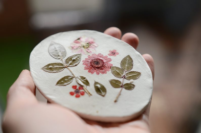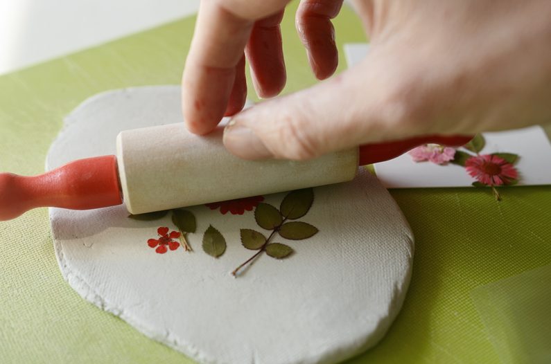 Sušené kvítky jemně válečkem zatlačte do hmoty.