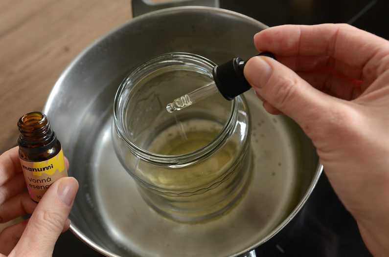 Svíčkový vosk nechte na sporáku rozpustit ve vodní lázni – nasypejte do varného skla, sklenici s voskem vložte do hrnce s pár centimetry vody a přiveďte k varu. Po odstavení nakapejte pár kapek oblíbené vonné esence.