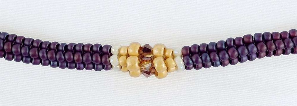 Nyní ušijte jednu řadu rokajlem D, jednu řadu rokajlem B, jednu řadu rokajlem F, jednu řadu cenovkami 28 a opět jednu řadu rokajlem F, jednu řadu rokajlem B, jednu řadu rokajlem D a pokračujte v šití rokajlem A dalších pět centimetrů.