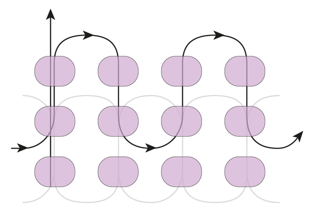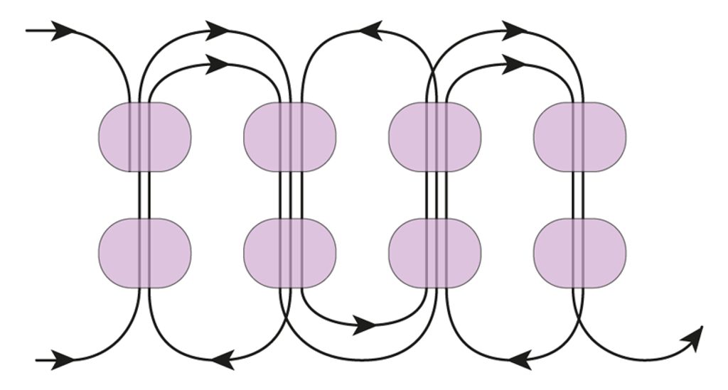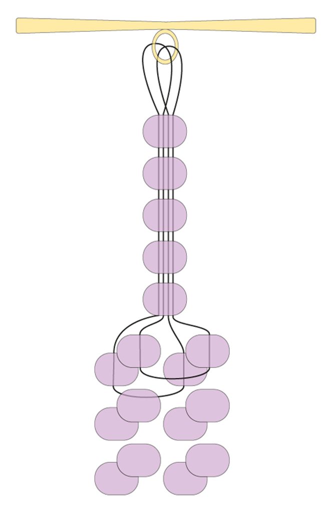 Navlékněte dva rokajly A nad první dvojicí rokajlů a vlasec protáhněte do horního rokajlu druhé dvojice rokajlů A. Opakujte nad druhou dvojicí rokajlů. U této druhé poloviny si všimněte, že vlasec protahujete vzhůru dvěma rokajly, řada se tak srovná. Dobře utahujte, ať rokajly sedí pěkně na sobě a šňůra je pravidelná. Opakujte až do délky šňůry 20 cm.
