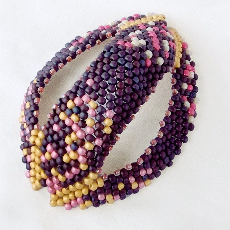 Stejně jako v krocích 1- 5 ušijte další oválek. Po jeho kompletním ušití ale vlasec nezapošívejte, po ušití vnitřní řady rokajly G protáhněte vlasec opět na obvodový oblouk a po jedné straně ušijte ještě jednu řadu rokajly A,B,C,D,G. Tato řada je nutná pro zipové sešití s prvním oválkem. Dejte pozor, abyste sešily oválky stejnou barevnou kombinací k sobě. Na obrázku vidíte takový zajímavý tvar s dvěma „dírami“, zatím to budoucí kvítek moc nepřipomíná, viďte… ale zkuste si prsty přitisknout k sobě zlaté špičky na protilehlých stranách – oválky se ohnout do obloučku…. Už to vidíte a je vám jasné, jak dál?
