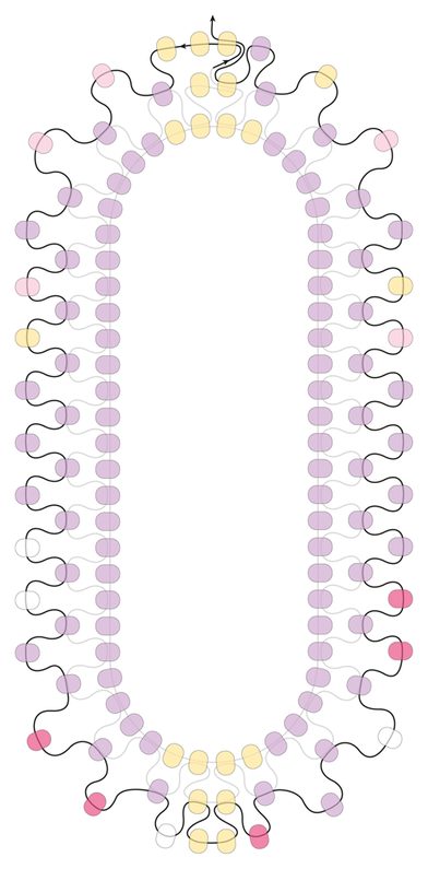 Nyní opakujte postup v dalších řadách tak, až na špičkách bude postupně 7 dvojic rokajlů B nad sebou. Postup šití je stále stejný, nyní jen budeme přidávat další barvy. Namísto rokajlů B přidávejte nepravidelně kolem jedné špičky rokajly C a D, kolem druhé špičky rokajly B a E, barevné rokajly střídejte se základním rokajlem A. Prostřední části oválků šijte rokajly A. Vzor je zde nepravidelný, pořadí rokajlů jednotlivých barev je zcela nahodilé. Nezapomeňte vždy na konci řady protáhnout vlasec dvěma rokajly B pro přechod do další rady.