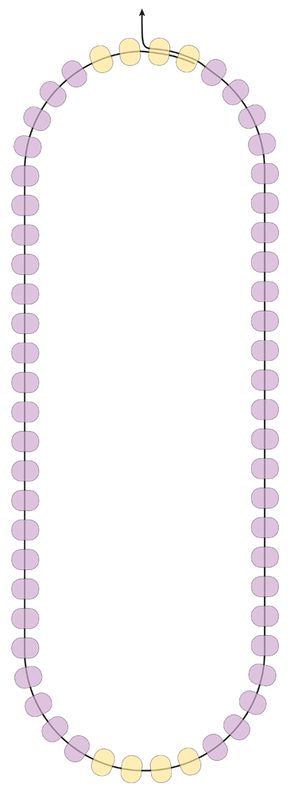 Protáhněte vlasec skrz rokajly do vnitřního oblouku a mezi rokajly B všijte po jednom rokajlu G. Mezi zlaté rokajly ve špičkách rokajl G nevšívejte, tyto rokajly jen stáhněte prošitím k sobě. Ušitý oválek se mírně stáhně a vytvaruje do obloučku.