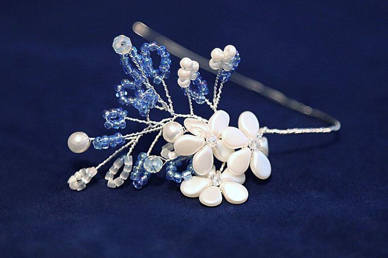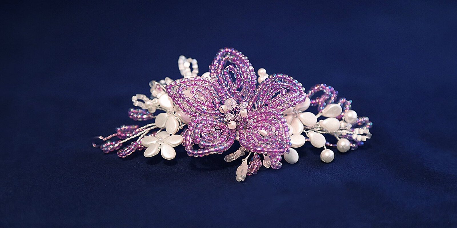 Vytvořte 1 dvojitý květ, 1 jednoduchý květ, 2 jednoduché přízdoby a 1 přízdobu se třemi květy vytvořenými z perlí Pip pro sponu na vlasy. Uspořádejte květy tak, aby odpovídaly délce spony.