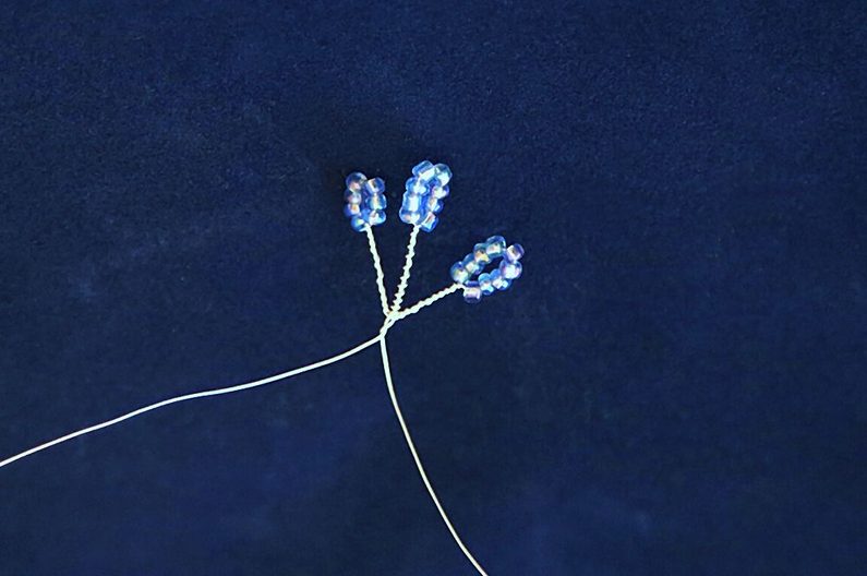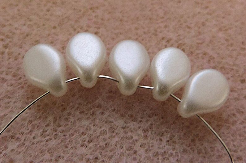 Další květy vytvoříte z perlí Pip. Navlékněte 5 perlí Pip na 0,30 mm drát. Spojte dráty a dvakrát je stočte, aby byly zajištěné.