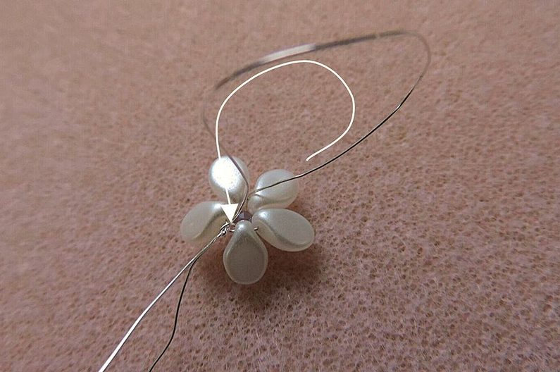 Stočte drát do délky přibližně 2 cm a pokračujte druhým květem. Použijte delší drát k navlečení 5 perlí Pip a zopakujte stejné kroky k vytvoření druhého květu.