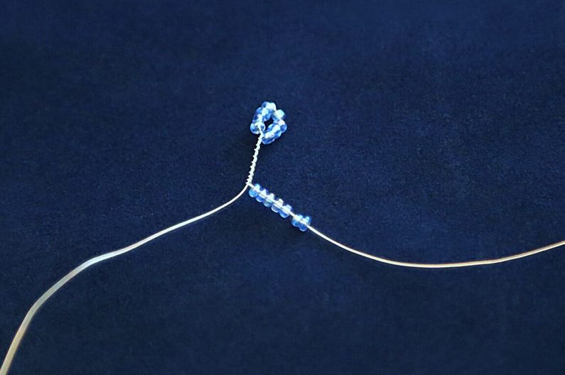 Navlékněte rokajl na měděný drát o průměru 0,50 mm (v tomto případě postříbřený, můžete také použít barevný drát v barvě rokajlu). Odpočítejte 9 rokajlu, vytvořte první smyčku, dvakrát drát stočte.