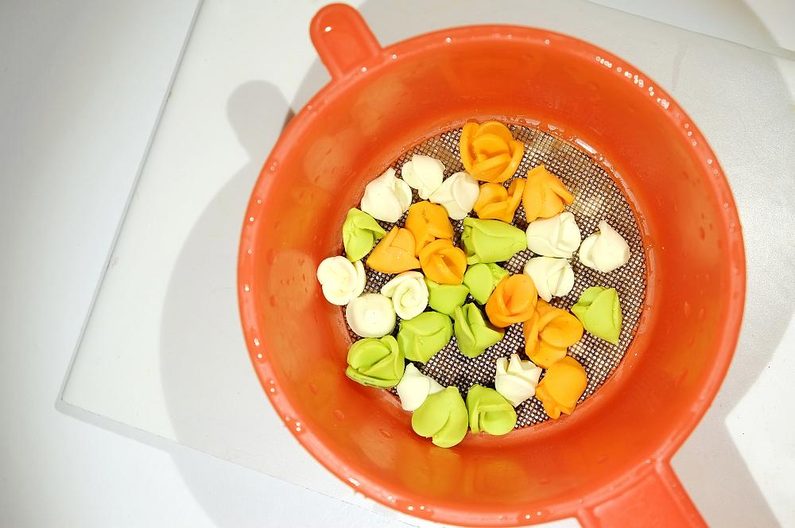 Kvítky ve škrobu pečte v elektrické troubě (nepoužívejte troubu plynovou ani mikrovlnnou) na 150 stupňů 30 minut. Poté kvítky pomocí lžičky nebo prstů (pozor, jsou horké) přeneste do cedníku a propláchněte, aby se smyl škrob.
