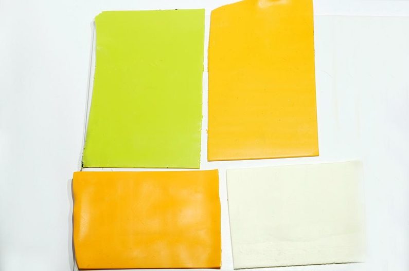 Všechny kousky hmoty dobře rozválejte válečkem a projeďte několikrát strojkem na nejširší nastavení, aby vám vznikly plátky. Žlutý plátek položte na oranžový, zaválejte válečkem a opět několikrát projeďte strojkem tak, aby se obě barvy smíchaly a docílilo se světlejšího oranžového odstínu. Plátky vyválejte na střední nastavení strojku. Plátky okrájejte na přibližně stejné obdélníčky. Odkrojenou hmotu dejte stranou, ještě ji možná použijete (záleží na tom, kolik budete chtít kvítků). Vidíte, že oranžový obdélníček ležící vpravo od zeleného je světlejší než ten ležící pod zeleným obdélníčkem – to je způsobeno právě smícháním oranžového a žlutého fima. Všechny plátky položte na pevnou podložku (skleněnou nebo dlaždici).
