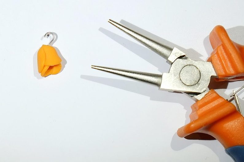 Nechte kvítky vychladnout, vezměte každý kvítek do prstů levé ruky a pomocí vrtáčku prostředkem vyvrtejte dírku – vrtáčkem vrťte v prstech. Nebojte se, fimo je sice tvrdé, ale vrtáček kvítkem projede během několika vteřin.