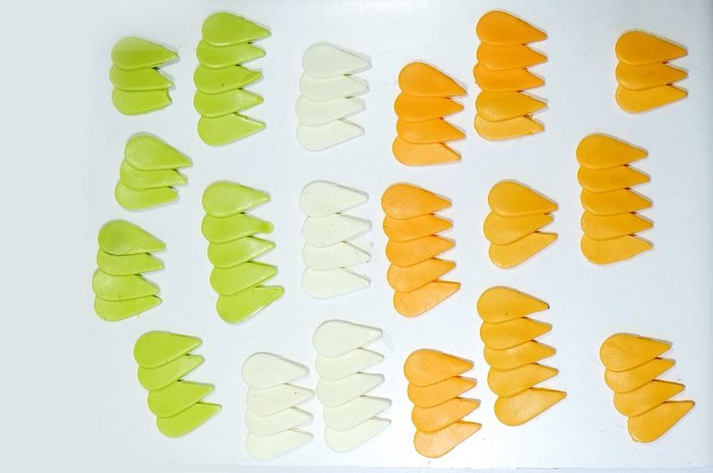 Ukrojte si dva přibližně stejné kusy oranžového fima, po jednom kusu zeleného a vanilkového fima a menší kousek žlutého fima.