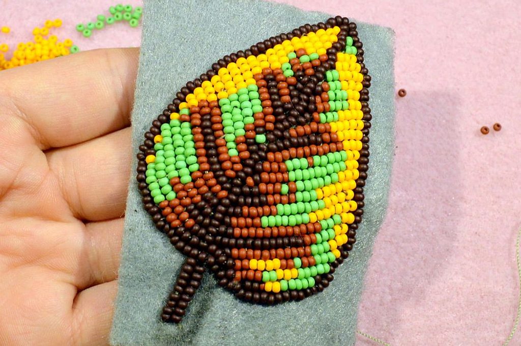 Nakonec díl obšijeme, zapošijeme nit a cihlovým stehem obšijeme kolem dokola. To jest. Provlečeme jehlu s nití na lícovou stranu a navlečeme první korálek velikosti číslo 8/0, jehlou píchneme zespodu pod korálek a korálkem protáhneme a utáhneme. Poté pokračujeme stejně s drobnou změnou, navlékneme malý korálek (10/0) a velký korálek 8/0 a zapíchneme opět zespodu pod velký korálek, protáhneme korálkem ven a postup opakujeme kolem dokola. Nakonec spojíme řady horem z velkého korálku pouze jedním menším do korálku vedle.