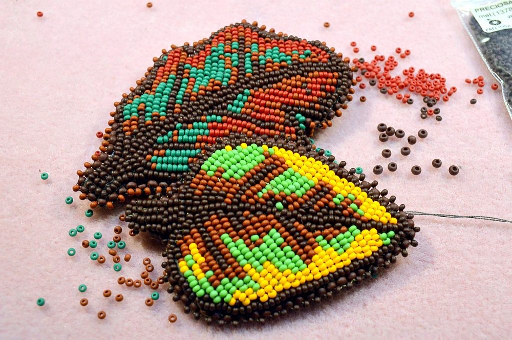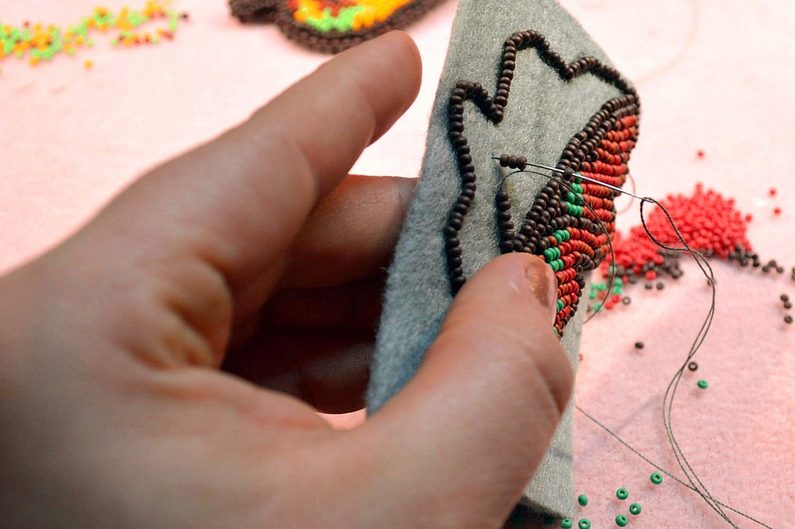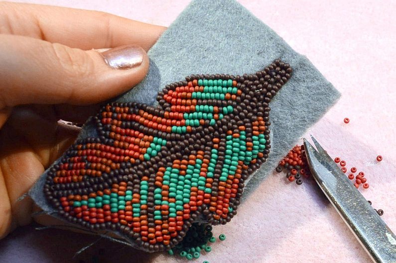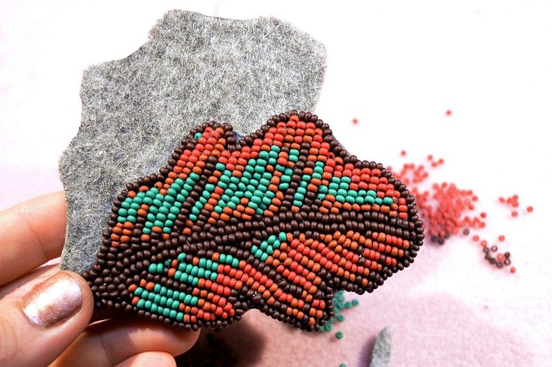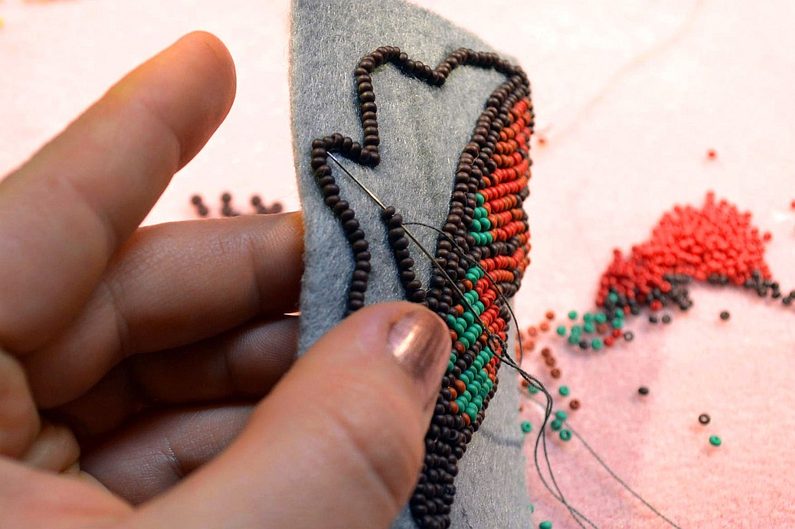Nakonec díl obšijeme, zapošijeme nit a cihlovým stehem obšijeme kolem dokola. To jest. Provlečeme jehlu s nití na lícovou stranu a navlečeme první korálek velikosti číslo 8/0, jehlou píchneme zespodu pod korálek a korálkem protáhneme a utáhneme. Poté pokračujeme stejně s drobnou změnou, navlékneme malý korálek (10/0) a velký korálek 8/0 a zapíchneme opět zespodu pod velký korálek, protáhneme korálkem ven a postup opakujeme kolem dokola. Nakonec spojíme řady horem z velkého korálku pouze jedním menším do korálku vedle.