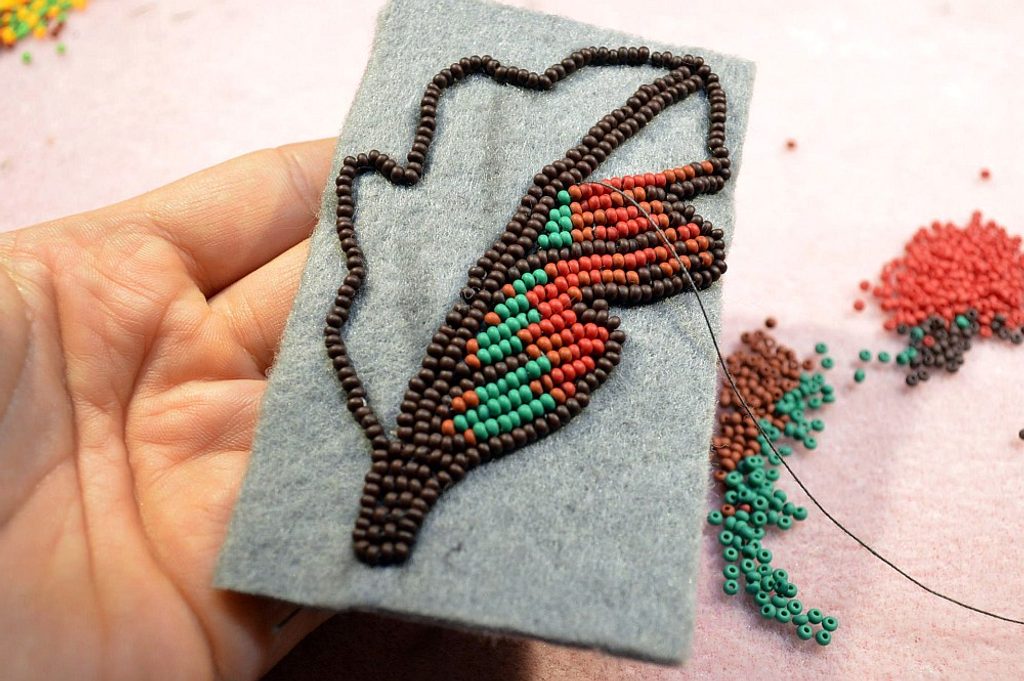 Naznačení žilnatosti. Vybereme si ve spodní části jednu „žilku“ kvůli sklonu výšivky, kterou začneme – na obrázku je vidět, že mám podklad pokreslený. Okolo tmavě hnědé použiji, kvůli stínování, světle hnědou. Okraje chci mít hnědočervené a u středu bude list zelený. Podle podkresu poznáme, kolik korálků navléct od jaké barvy, vyměřujeme a dodržujeme sklon řadu za řadou.