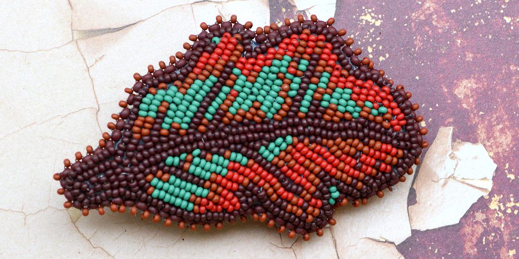 Žilnatost je zachována v tmavém odstínu, okolo je stínováno hnědou a plochy zachovávám v hnědočervené a zelené. Když nám dojde nit, prostě navlečeme jinou a pokračujeme pořád stejně. Hlídáme si vzdálenost a počet korálků, někdy je lepší si řadu a navlečené korálky vyměřovat na předkresleném vzoru. Obzvlášť pokud s výšivkou začínáme. Řady můžeme také střídat v několika barvách, jednoduchých pruzích a podobně.