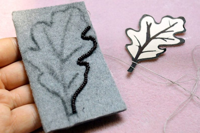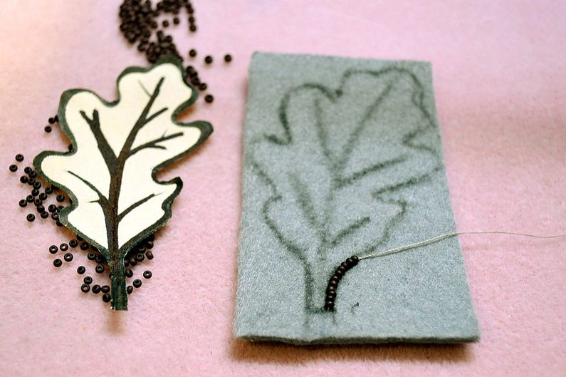 Nejdříve vyšíváme obrysy. Pro obrys jsem zvolila rokajl od Preciosy vel. 10/0. Je krásně tmavohnědý. Není vždy nutné používat na rámování černou, obzvlášť pokud jde o podzimní tematiku. List dubu se vybarvuje krásně do červenozelena až hněda. Těchto odstínů se můžeme držet.