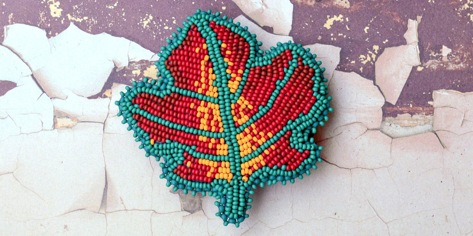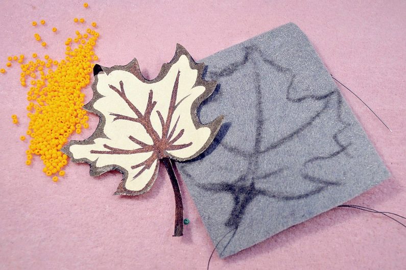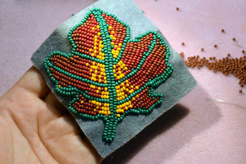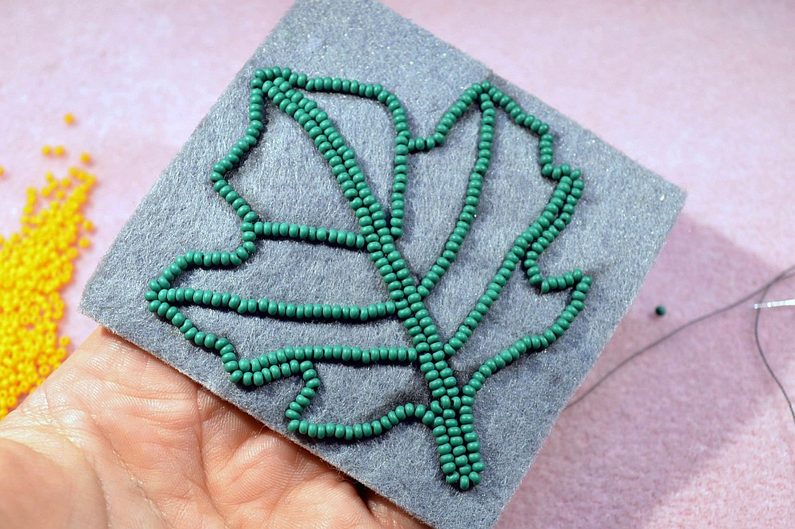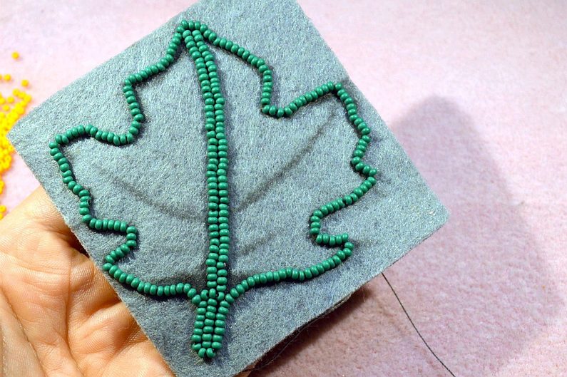 Nejdříve vyšíváme obrysy. Pro obrys jsem zvolila rokajl od Preciosy velikost 10/0 mat v tmavě zelené. Není vždy nutné používat na rámování černou, obzvlášť pokud jde o podzimní tematiku. List javoru se vybarvuje krásně do zelenočervena, žluta. Těchto odstínů se můžeme držet.