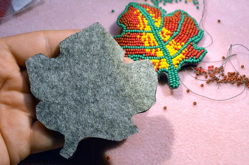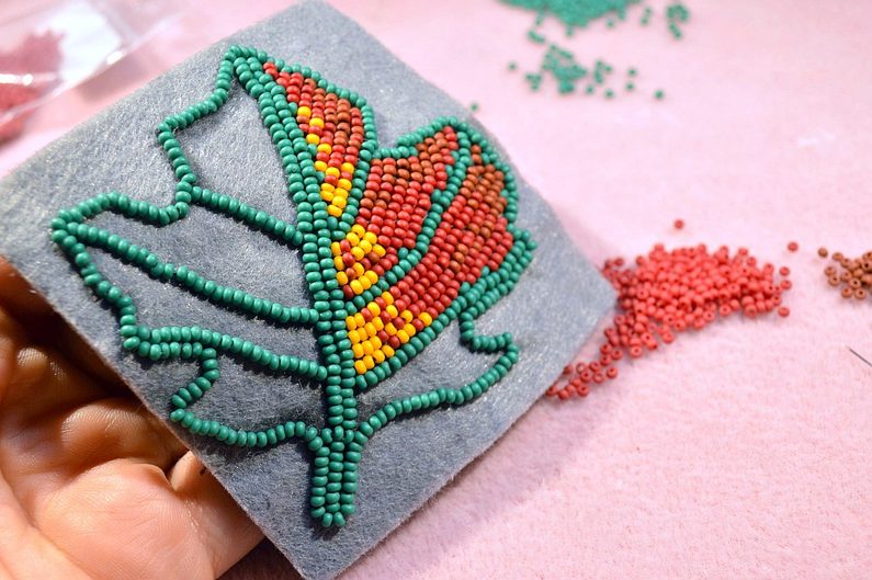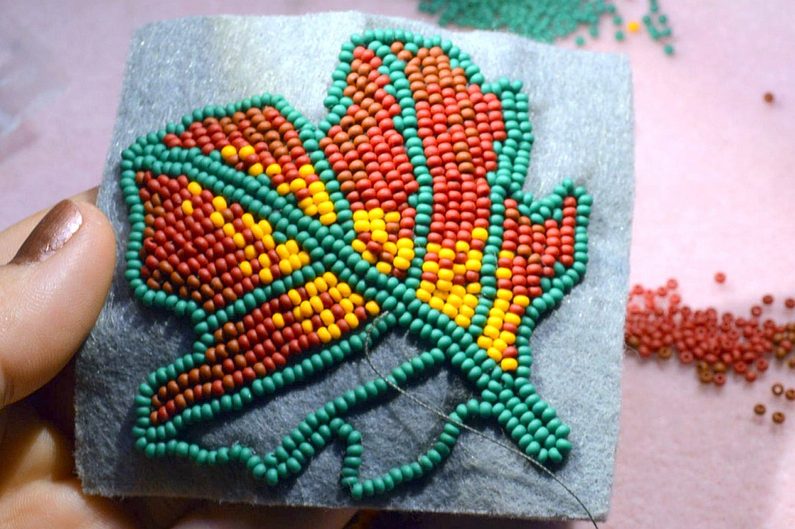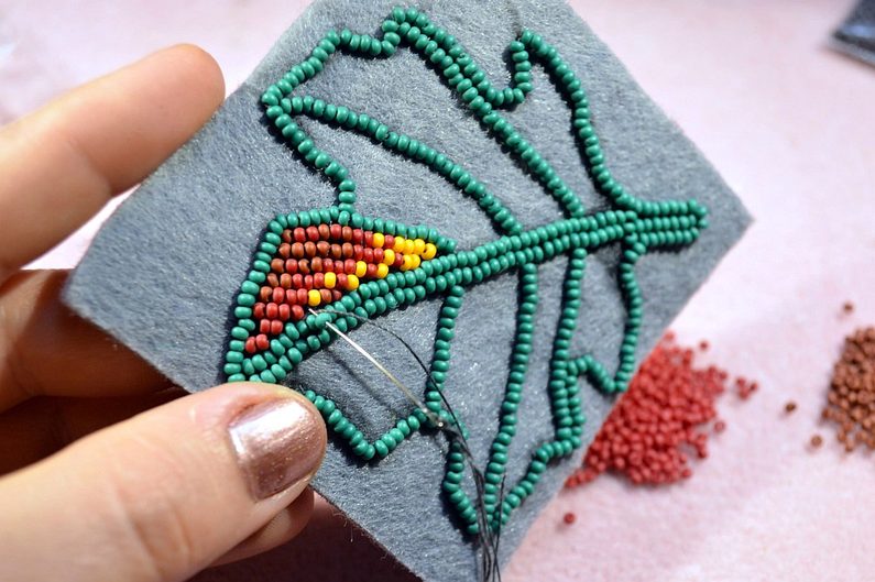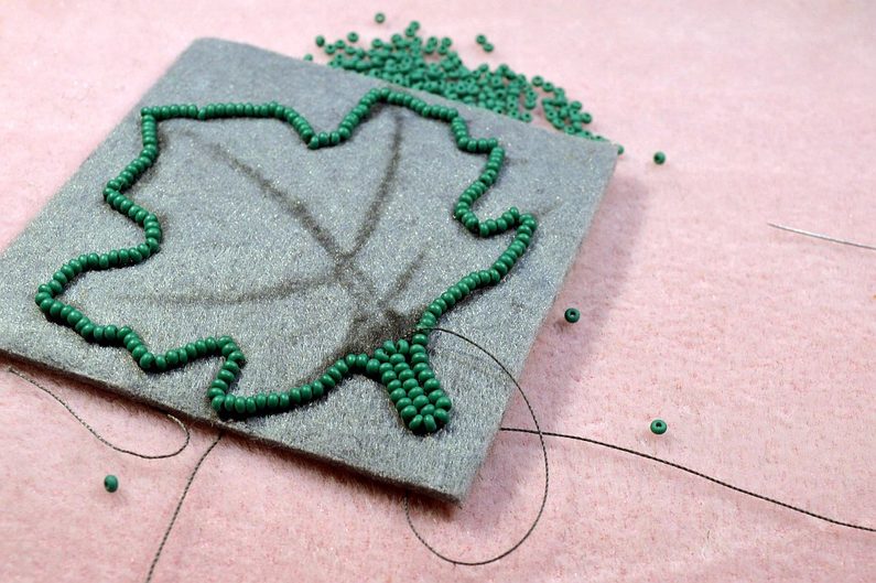 Je třeba dodržovat linii, vpichovat jehlu vždy pod korálky a počítat tak s tím, že okolo řady list vystřihneme. Pokud bychom vypichovali do boku, mohlo by se nám pak stát, že po hodinách práce prostřihneme okraj, což nechceme. :) Dále pokračujeme kolem dokola listu. Přepůlení listu – opět dbáme na to, abychom vpichovali rovně do podložky, ne šikmo, kvůli riziku prostřihnutí. Vždy zajistíme navlečené korálky zpětným stehem podle plánku.