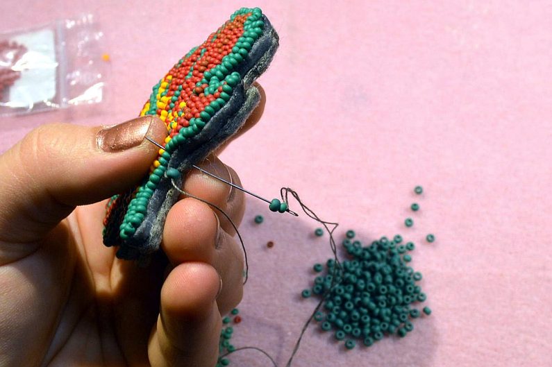 Nakonec díl obšijeme, zapošijeme nit a cihlovým stehem obšijeme kolem dokola. To jest. Provlečeme jehlu s nití na lícovou stranu a navlečeme první korálek velikosti číslo 8/0, jehlou píchneme zespodu pod korálek a korálkem protáhneme a utáhneme. Poté pokračujeme stejně s drobnou změnou, navlékneme malý korálek (10/0) a velký korálek 8/0 a zapíchneme opět zespodu pod velký korálek, protáhneme korálkem ven a postup opakujeme kolem dokola. Nakonec spojíme řady horem z velkého korálku pouze jedním menším do korálku vedle.