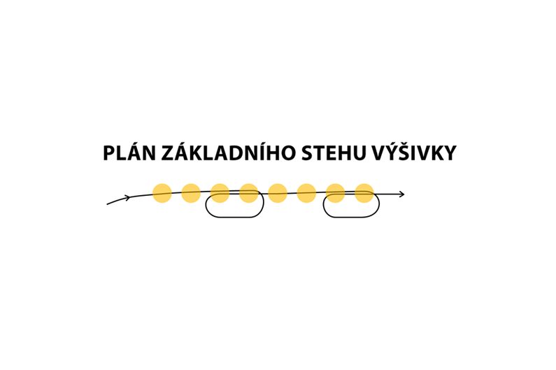 Obšívání okrajů by mělo být velmi pečlivé. Začínáme tak, že zapošijeme nit, na jehlu vytaženou na lícové straně veprostřed čáry navlékneme 4 korálky a vpíchneme zpět do podkladu ve vzdálenosti na počet korálků, které jsme navlékli. Jehlou se naspodu vrátíme zpět a v polovině navlečených korálků vpíchneme. Dostaneme se tak na lícovou stranu a polovinu korálků provlékneme. Postup opakujeme. (Viz plánek) Můžeme navlékat i po dvou. Nebo po třech. Závisí na složitosti tvaru.