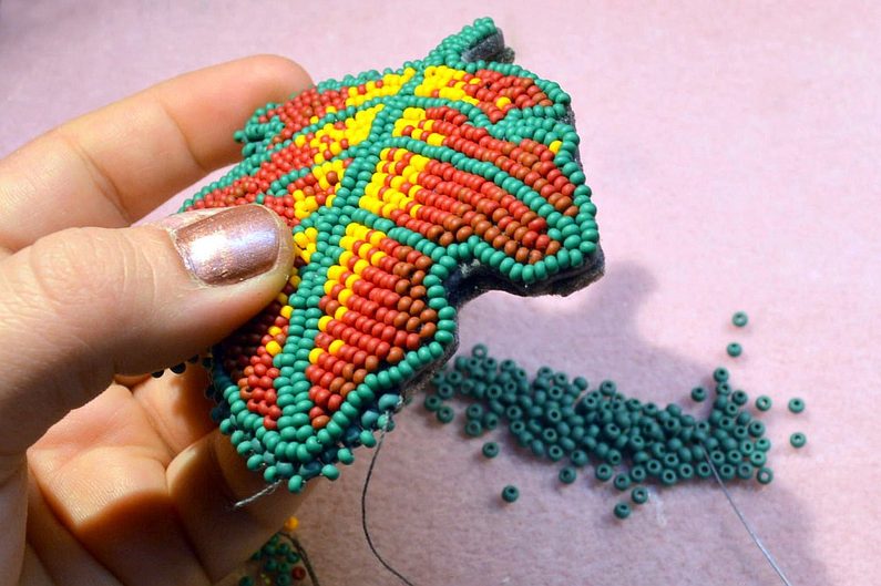 V momentě, kdy ukončíme jednoduchý obrys, můžeme přejít k „vybarvování“. Můžeme si odstíny třeba předkreslit podle živého modelu na šablonu pastelkami a držet se vzoru při navlékání korálků a vyšívání.